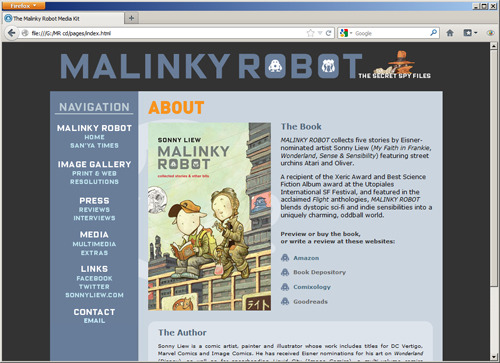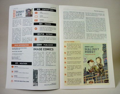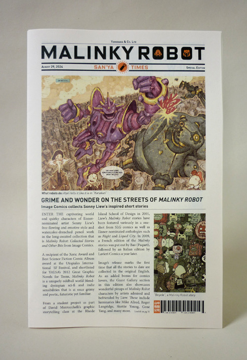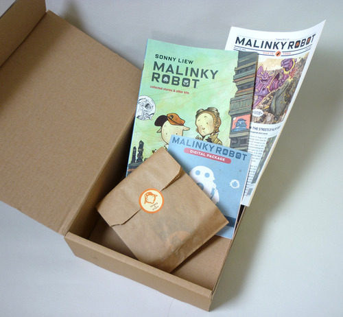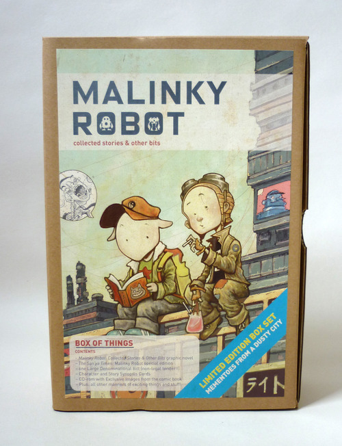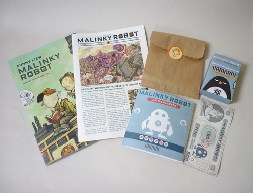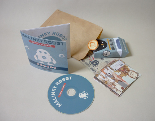 A press kit to promote Malinky Robot, a graphic novel by Sonny Liew. It includes a copy of Malinky Robot, trading cards and a cd with information about the graphic novel.